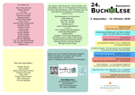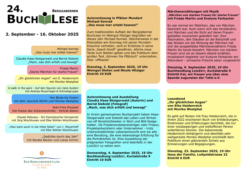 Buchlesezeit in Bad Bergzabern - nach einem trüben Frühjahr und einem überhitzten Frühsommer freuen wir uns, Ihnen das Programm der diesjährigen BuchLese vorzustellen. Vom 2. September bis 16. Oktober bespielt die BuchLese Weingüter, Marktkirche, Stadtmission, Kurpark, Haus der Familie und die Buchhandlung LeseZeit mit einem bunten Programm aus Literatur, Musik und bildender Kunst.