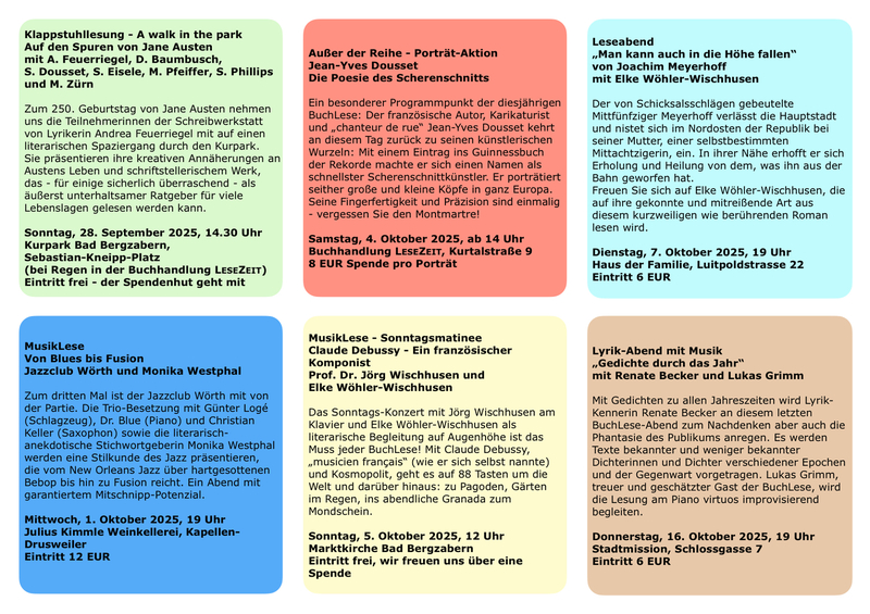 Elke Wöhler-Wischhusen wird Passagen aus „Man kann auch in die Höhe fallen“ des Schriftstellers Joachim Meyerhoff vortragen. Monika Westphal liest aus Elke Heidenreichs Buch „Ihr glücklichen Augen“. Die Schreibgruppe um Lyrikerin Andrea Feuerriegel unternimmt mit dem Publikum einen Lesespaziergang: auf Jane Austens Spuren durch den Kurpark (oder bei schlechtem Wetter in der Buchhandlung LeseZeit).